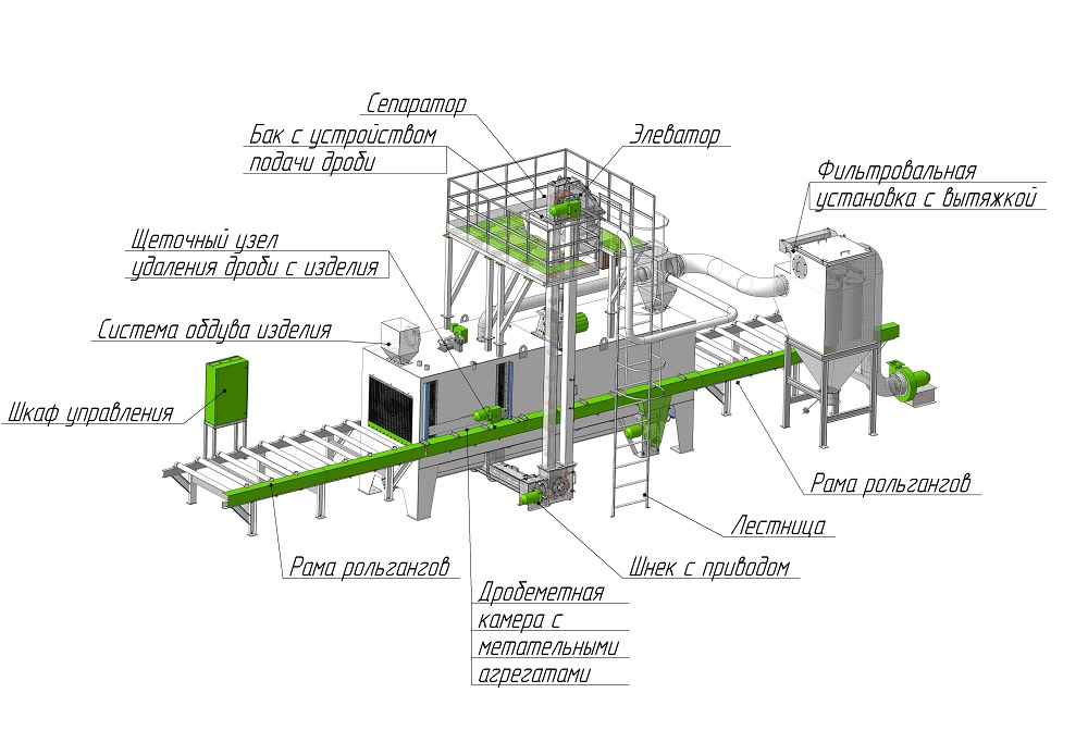 Проходная дробеметная установка всего за один проход очищает металлопрокат, металлоконструкции, листовой прокат и профильные заготовки листа от окалины, ржавчины и загрязнений. Перед началом работы в вертикальное или горизонтальное выходное окно, подача металлоконструкций в дробеметную камеру осуществляется по рольгангам, которые управляются с электрического шкафа управления. Дробеметные метатели расположены под разными углами так, чтобы изделие находилось в центре схождения пучков направления дроби. Дробеструйные установки имеют качественные комплектующие европейского и российского производства, что обеспечивает простоту и надёжность конструкции, а приемлемая цена объясняет особую популярность таких установок.